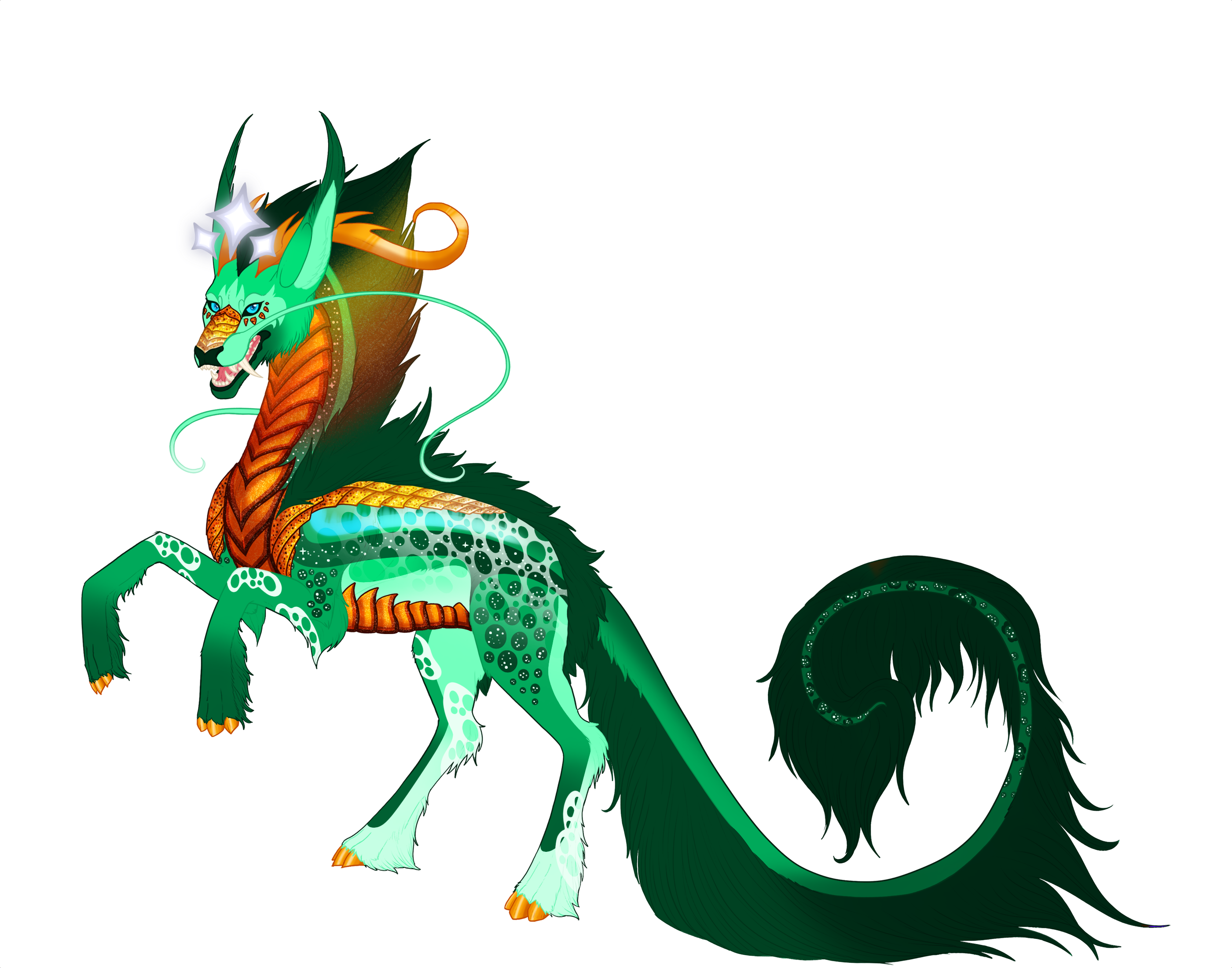 Phenotype: Topaz Gold with Dipped, Fade, Frosted, Gradient, Mask, Panda, Pangare, Sable, Spots, Underbelly, Gazelle, Iridescent Scales, Siamese, Ocelli, Piebald, Pigeon, Tricolor and Gilded