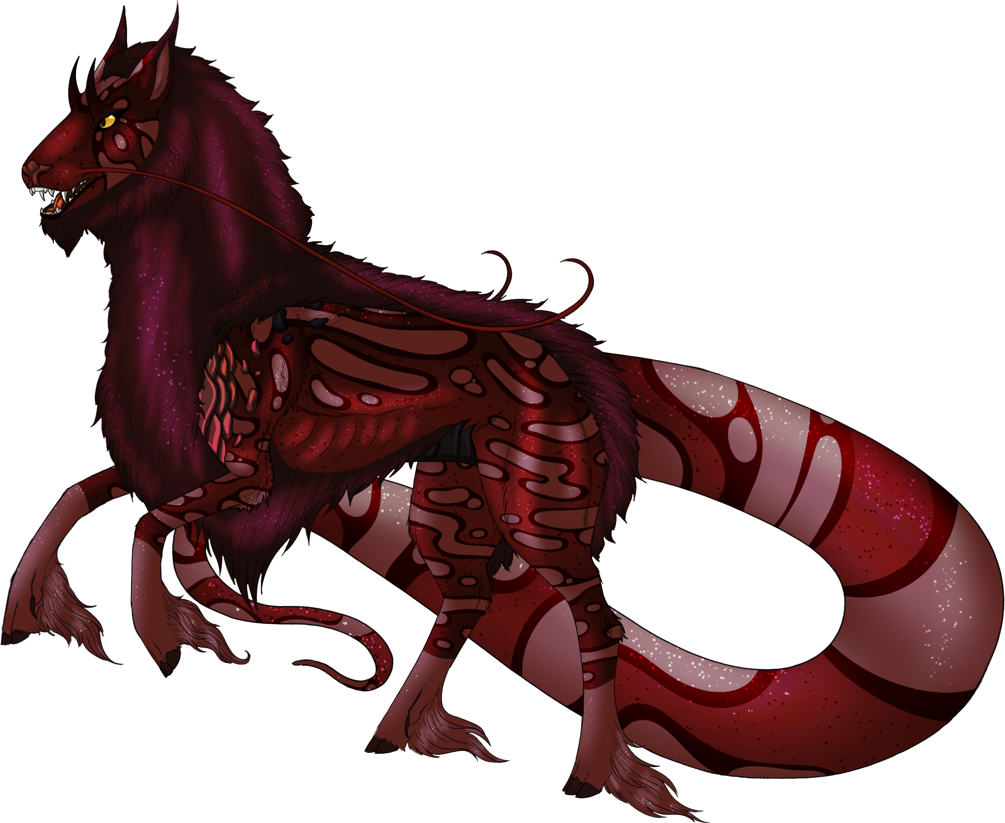 Phenotype: (---) (Erythristic Chestnut with Fleabitten, Sable, Socks, Bicolor, Python, Siamese, Dorsal, Shimmer, and King Cheetah)