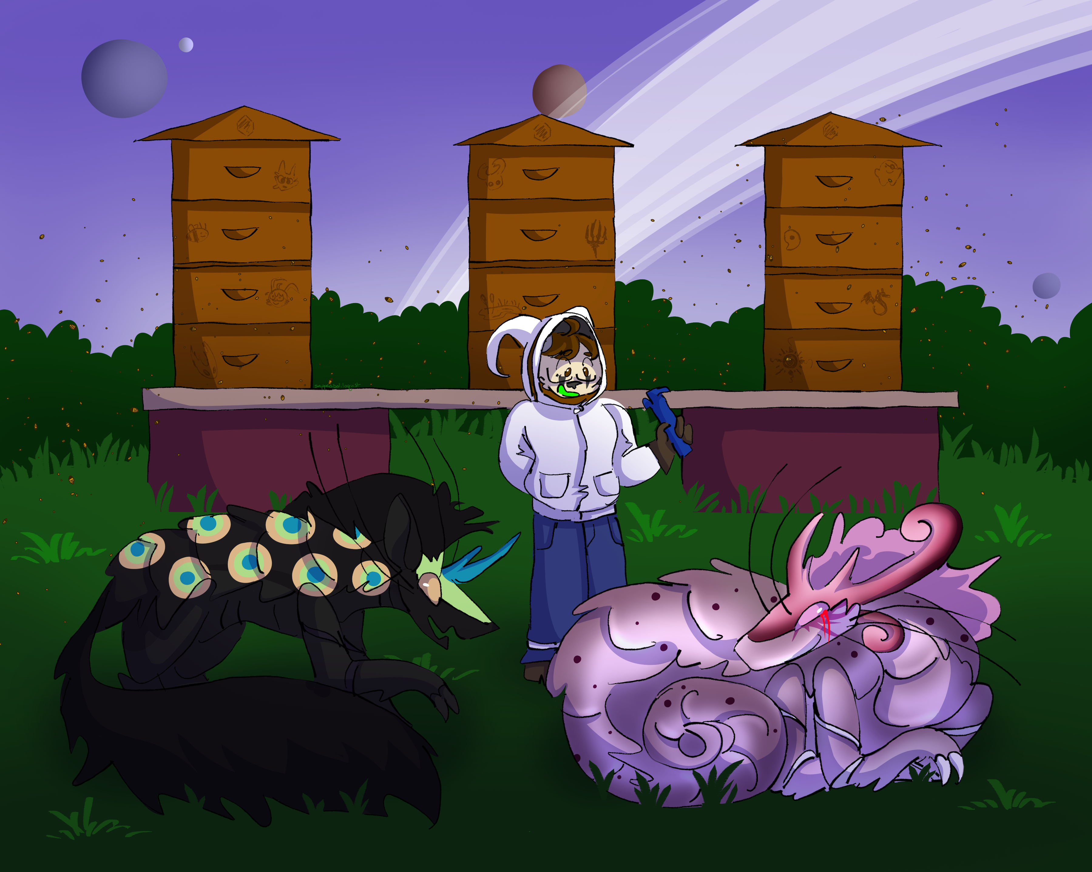 Gathering Activity Roll. Ame teaches Patchy and Pink Cadillac how to prepare to gather honey from beehives. Patchy, ever knowledgable about bugs, is also very excited to butt in and offer up his own knowledge on the subject. Pink Cadillac is happy to listen and enjoy their company.